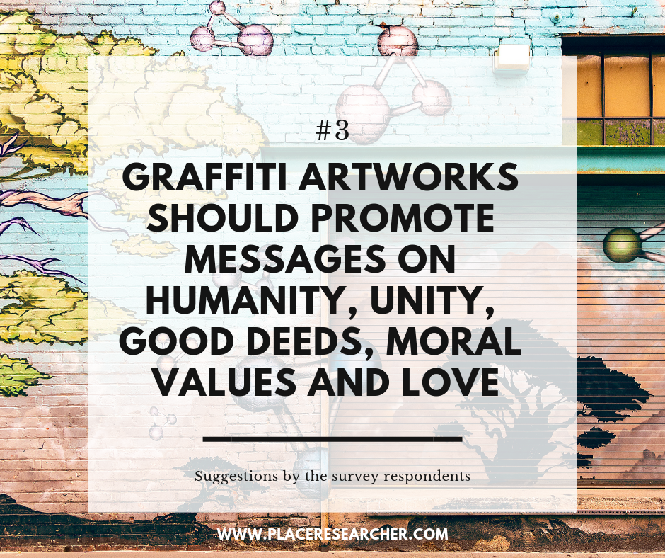 When asked about what the respondents would suggest as potential themes for graffiti artworks, both Muslims and non-Muslim shared similar ideas. They felt that graffiti artworks should promote messages on humanity, unity, good deeds, moral values and love. This particular finding reinforced that as humans, regardless of religion, culture and gender, good values are universal. Art in the public space can definitely become a medium to communicate good values in a creative way.
